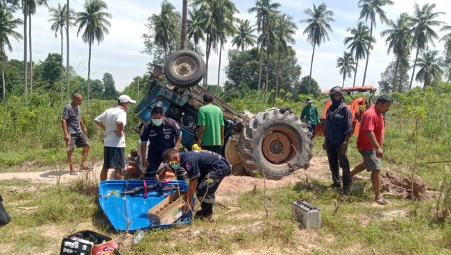 เกิดเหตุรถไถติดหล่มพลิกคว่ำทับร่างคนขับได้รับบาดเจ็บเจ้าหน้าที่กู้ภัยต้องเร่งช่วยเหลืออย่างเร่งด่วน