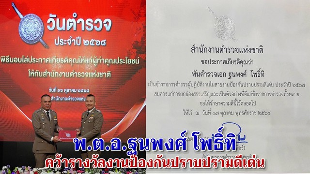 พ.ต.อ.ฐนพงศ์ โพธิ์ทิ ผกก.สภ.เสม็ด รับโล่ข้าราชการตำรวจที่ปฏิบัติหน้าที่สายงานป้องกันปราบปรามดีเด่น ประจำปี 2568
