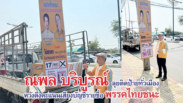 ณพล บริบูรณ์ ผู้สมัคร สส.ระบบบัญชีรายชื่อ พรรคไทยชนะ เบอร์ 17 ลุยติดป้ายทั่วเมืองชลบุรี หวังเรียกคะแนนเสียงให้กับพรรค